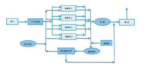 Specificațiile rezervorului de adsorbție și cantitatea de încărcare a adsorbantului sunt proiectate în funcție de volumul de aer pentru a asigura o anumită viteză a gazului și timp de rezidență, astfel încât adsorbantul să poată absorbi eficient și complet solventul organic din gazul rezidual. Rezervorul de adsorbție funcționează alternativ, iar starea de funcționare a rezervorului de adsorbție este comutată automat de sistemul de control automat PLC pentru a efectua alternativ cele trei procese de adsorbție, desorbție, răcire și uscare și așa mai departe.