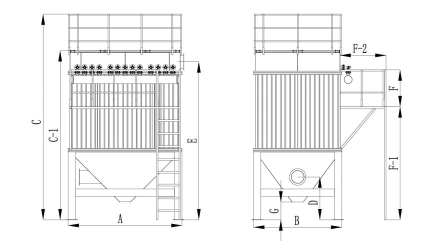 Notă: Din cauza restricțiilor de amplasament sau a restricțiilor de transport, numărul de buncăre pentru colectoarele de praf cu pungi cu impulsuri poate varia: 1 sau mai multe etc. Orificiul de descărcare poate fi echipat cu supape pneumatice, supape electrice și descărcatoare automate.